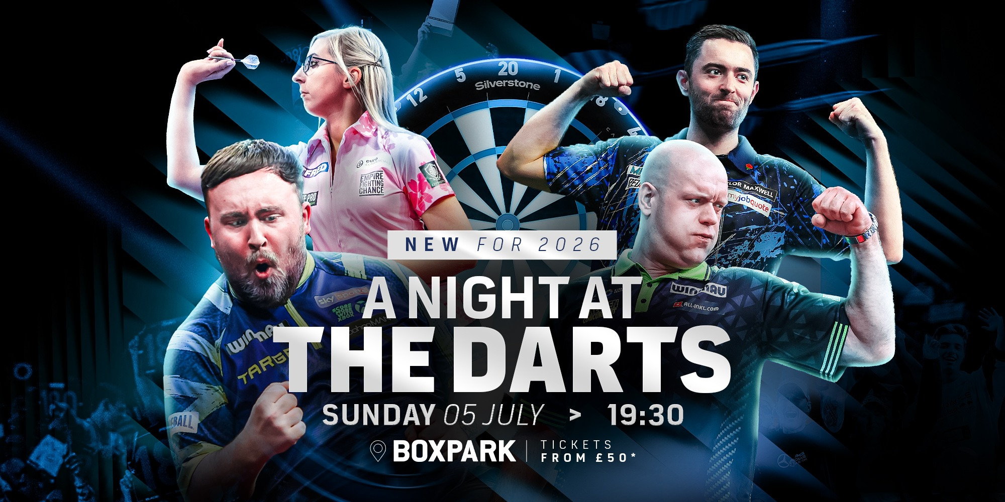 For the first time ever at the British Grand Prix, four of the biggest names in darts take to the oche for A Night at the Darts - a special live exhibition match at BOXPARK! Expect big walk-ons, huge finishes and the electric atmosphere that makes darts one of the UK’s most thrilling nights out.