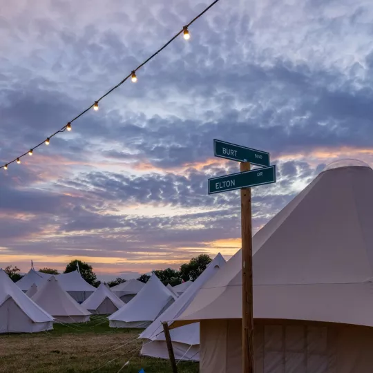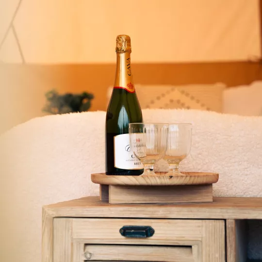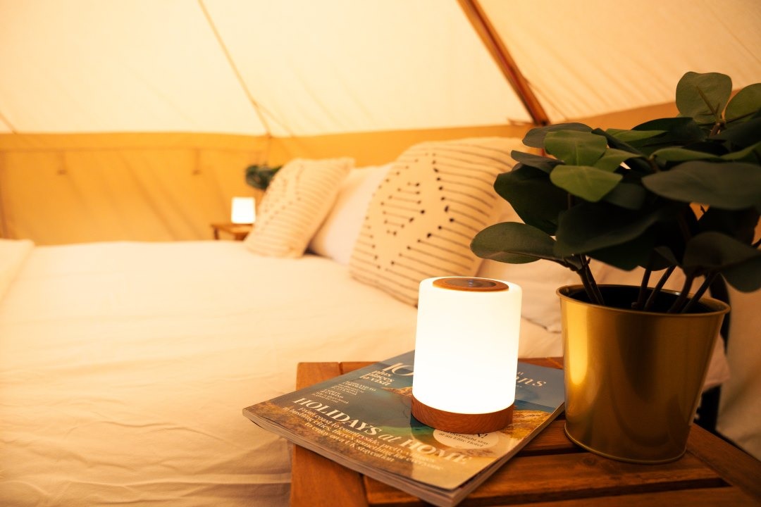 A quality canvas 5m Bell Tent furnished with proper beds, bedding and lighting. Space for up to 4 guests.