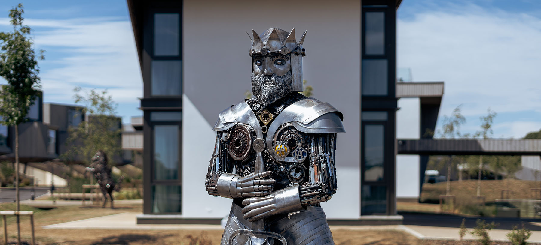 Motion and Mythology: Sarah Mae Francis transforms car parts and sheet metal into Enzo, a dynamic horse that demands attention. Her Knight (affectionately known as Mr Silver Stone) stands as a powerful figure at the circuit.