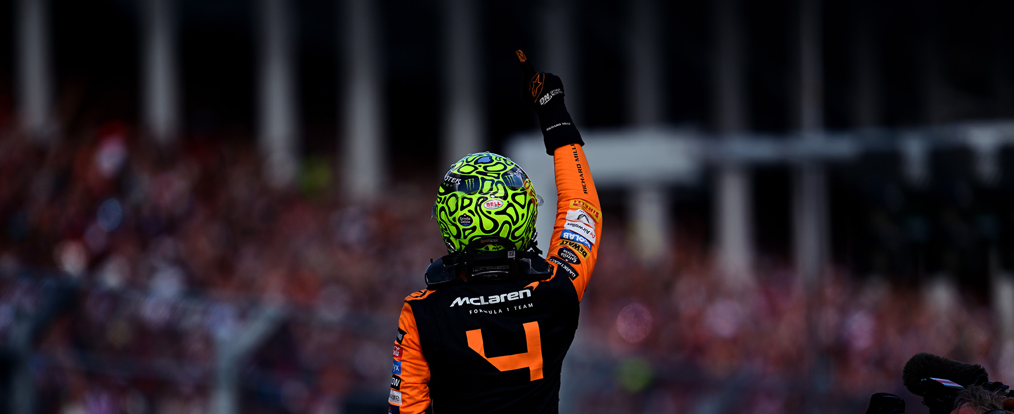 The 2025 British Grand Prix at Silverstone was a special race for Lando, with his first ever dedicated grandstand taking over Stowe corner. After qualifying in P3, Lando capitalised on a penalty for Piastri to make his way to the front of the field, leading him to win his first ever British Grand Prix in front of an adoring home crowd and a neon-filled Landostand. In Hungary, he claimed the lead from fourth on the grid and won the race to close the gap to Piastri to only nine points. The Dutch Grand Prix looked to be another podium finish for Lando, but an oil leak in the closing laps of the race left him with no choice but to retire, dropping 34 points behind Piastri. Despite a difficult weekend, Lando wasn’t out of the Championship battle just yet.