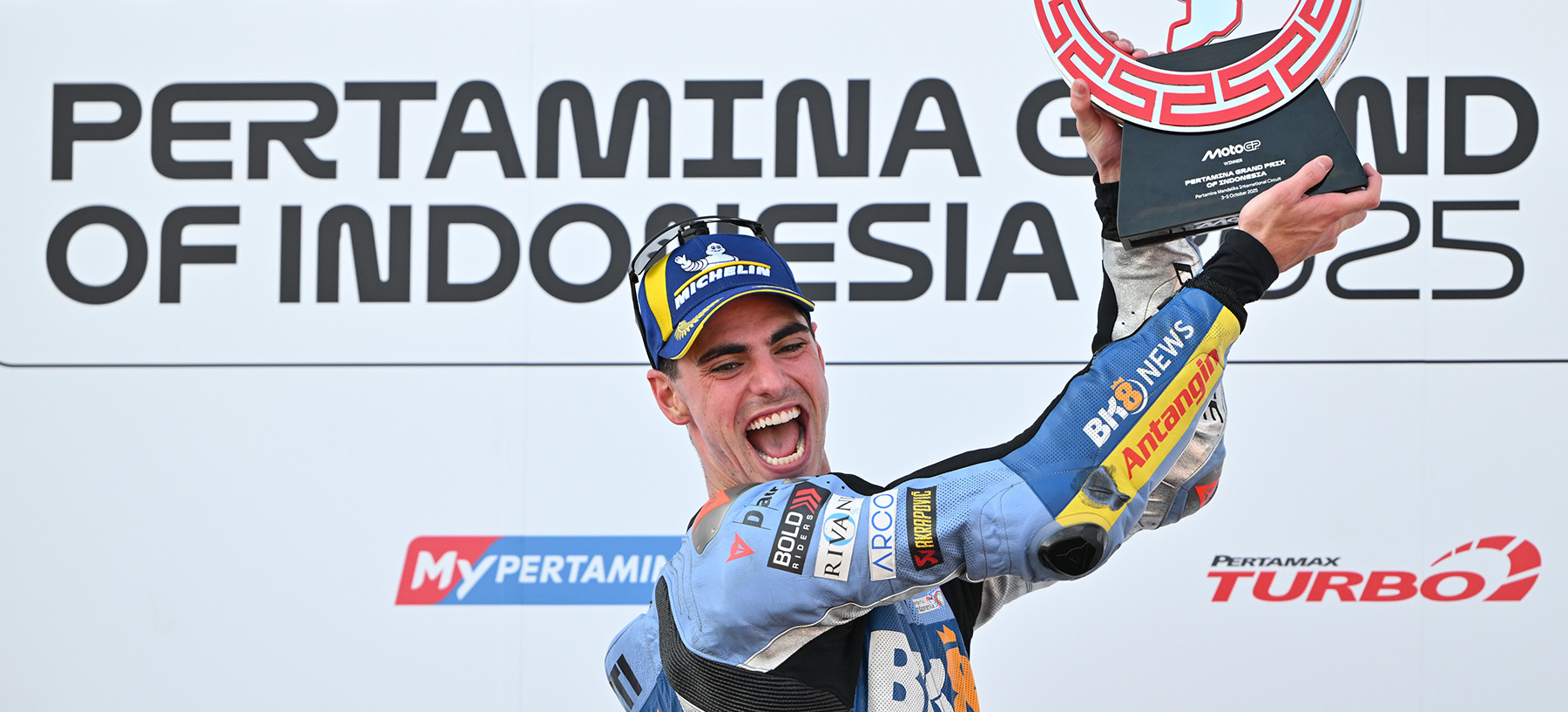 A series of unpredictable events were the backdrop for Jose Antonio Rueda finally securing the 2025 Moto3 World Championship at the Grand Prix of Indonesia. Rueda was running in 2nd when red flags were brought out during the penultimate lap of the Moto3 race, following an incident involving Adrian Fernandez and David Muñoz. His hopes of clinching the title seemed confirmed as his two closest Championship rivals, Maximo Quiles and Angel Piqueras were both given long lap penalties for a shortcut at Turn 9. Whilst Piqueras chose to serve his penalty at the earliest opportunity, Quiles chose instead to catch up with the leading trio of Muñoz, Fernandez, and Rueda before serving his penalty.